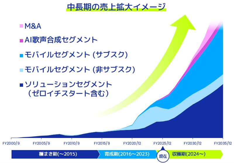 ibisPaintという既存の資産による成長を拡大させる一方で、さらにM&Aによる成長加速にも取り組んでいます。これは2024年の春から検討を始め、2025年に実行しました。中長期での飛躍的な売上拡大を実現するには、時間と人材に限界があります。そこで、シナジーのある企業を迎え入れることで、成長スピードを上げる選択をしています。M&Aの狙いは一貫して「シナジー」です。2025年はibisPaintと親和性の高いスマホアプリ領域において、歌声合成事業という創作文化の文脈で相乗効果を見込めるテクノスピーチをグループに加えました。これを受けて、AI歌声合成アプリ「VoiSona」との連携を通じてイラストや動画制作に音楽表現を組み合わせるなど、動画と音楽を横断した新しい制作体験の実現に向けて段階的な取り組みを進めています。